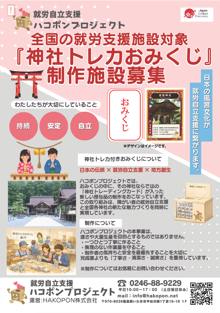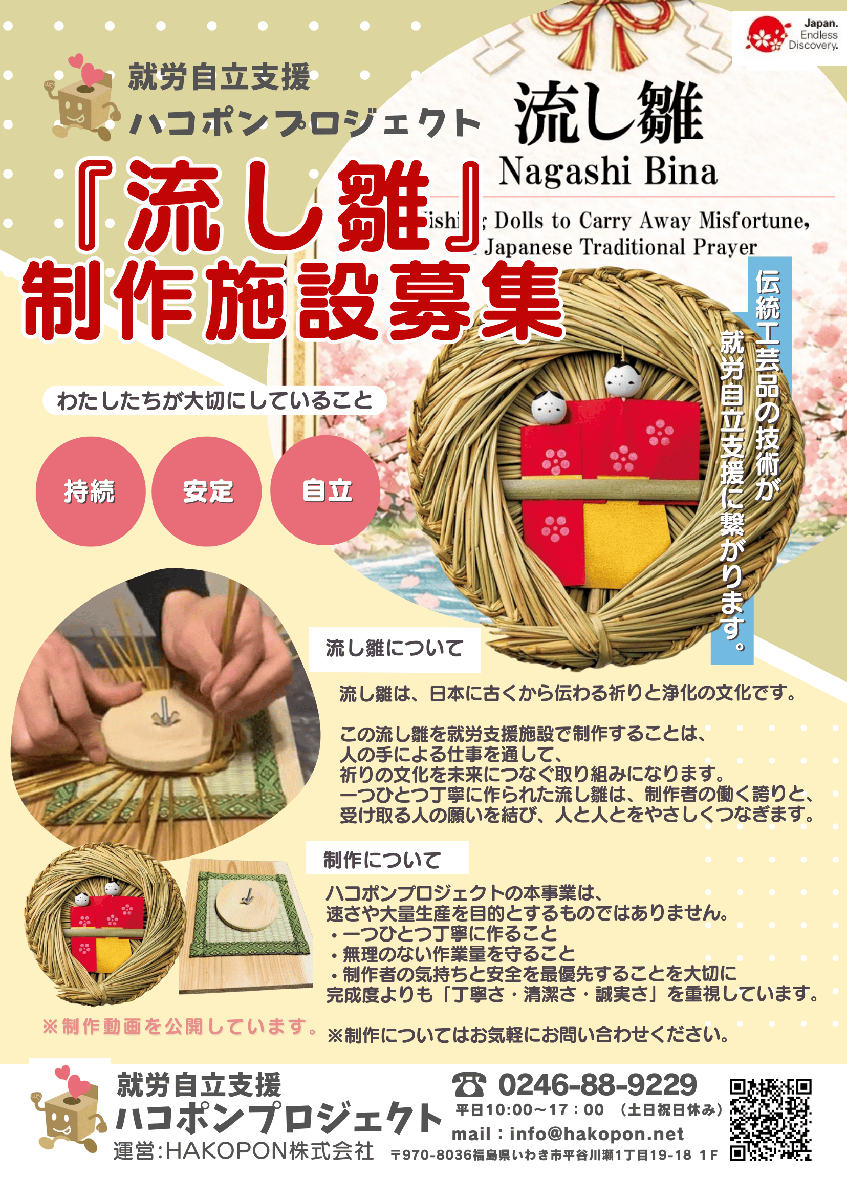 | 取扱商品 | ハコポン関連グッズの企画・制作・販売 伝統工芸品(流し雛)制作・販売 神社トレカの企画・制作・販売 |